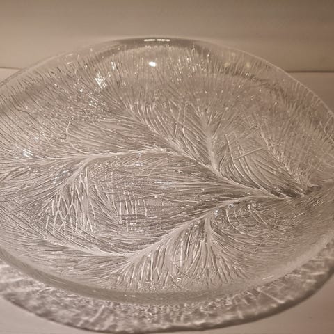 Glassfat med flettet mønster. Perfekt for servering av mat eller som dekorativt element. Fatet har et elegant design som passer til ulike anledninger.