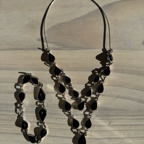 Nydelig smykkesett med halssmykke og øredobber. Oransje farge på steinene.