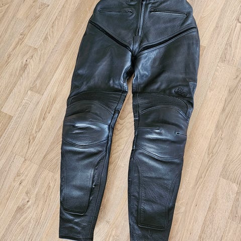 Buksen er selebukse i skinn, med ekstra polstring av knærne og regulerbar på høyde pga selene.