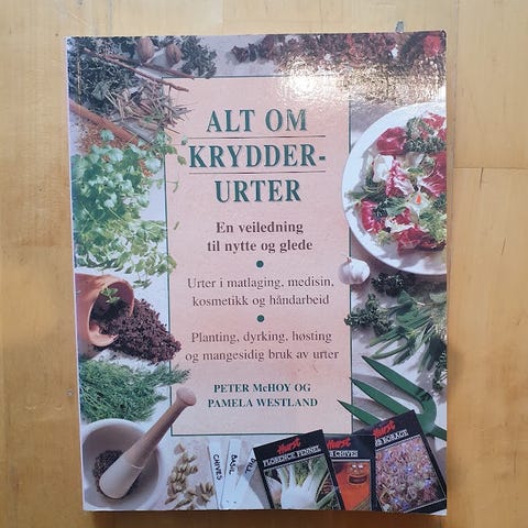 Må hentes. Flott illustrert bok, råd for dyrking i hagen, matoppskrifter, krydderurter i husholdning og urter til kosmetikk m.m. 287 s.