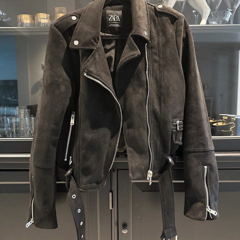Bikermodell som lukkes med diagonal glidelås foran.
