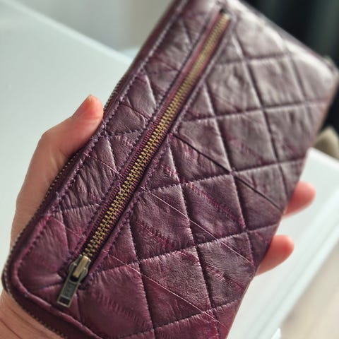 Knapt brukt clutch eller toalettmappe/ sminkepung. Hanskemykt skinn, farge hvit. Begge glidelåser funker, noen bittesmå flekker inni er eneste tegn på bruk.
