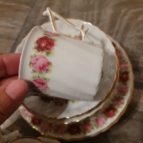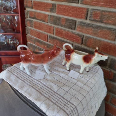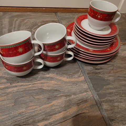 12 kopper og asjetter, to lysestaker, kanne, fat, sukkerskål og fløtemugge.