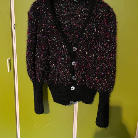 Lekker strikket jakke med for. Holdes sammen foran av knapp og liten beltespenne. 97% viskose. Størrelse 42, se mål. Pent brukt. Lengde fra overkant skulder til nedre kant ca 57 cm. Omkrets under armer ca 90 cm, omkrets liv ca 85 cm. Billigste porto. Se også mine øvrige annonser.