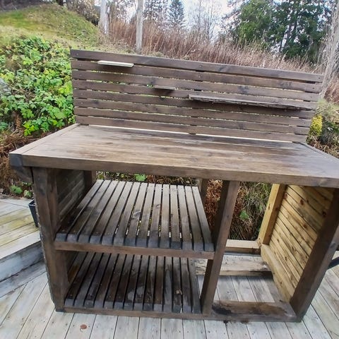 Gammel og solid benk med trekk og liten oppbevaringshylle.