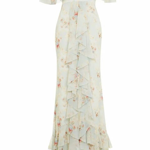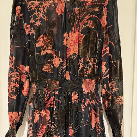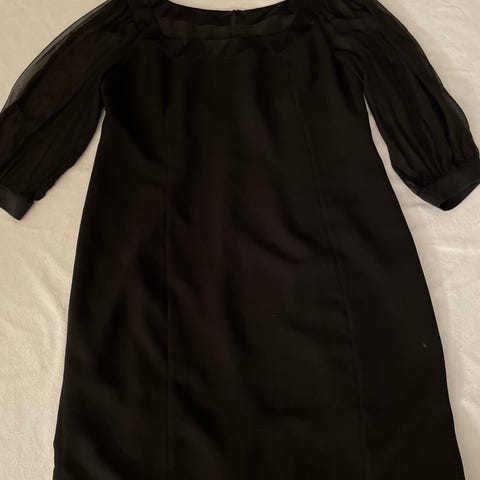 Flott selskapskjole i chiffon kjøpt på Elegant i Kristiansand. Knyting i nakken og glidelås i rygg. Sjal medfølger. Størrelse 12, Kjolen er justert litt på lengden, utført av butikk. Kjolen er kun brukt en gang. Har et lite merke i chiffon på bunnen av kjolen, se siste bilde.