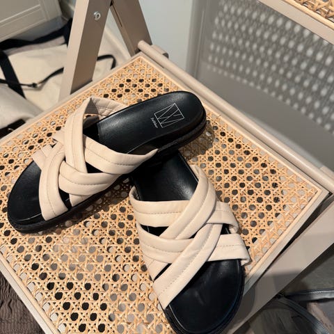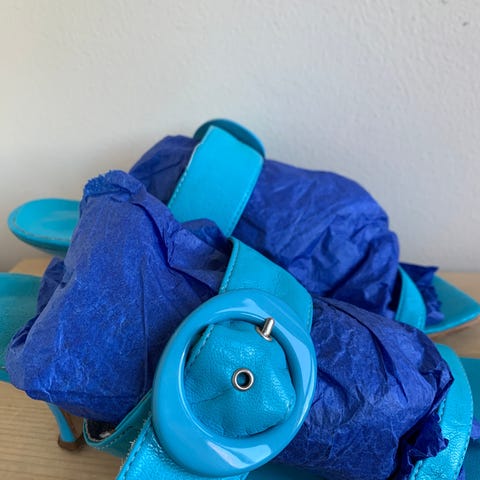 Skinn med gulldetaljer. Designet i Danmark (dansk design) og produsert i Italia. Så å si ikke brukt. Sandalene er helt nydelige synes jeg, men er dessverre litt for små for meg og dermed blir de ikke brukt.