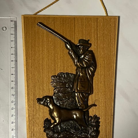 Vintages jegerfigur i metall på treplate. Mål på bilde.