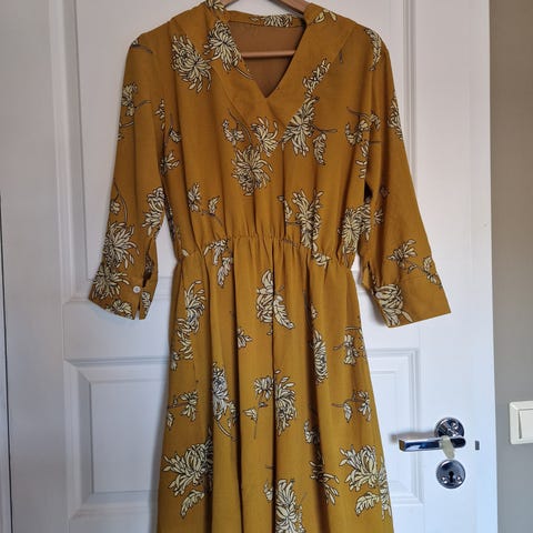 Knapt brukt én gang. Merket som S, men topp på meg som er 38 / M. Mål mellom armhulene ca. 52 cm, lengde fra skulder ca. 120 cm. Bruk med eller uten beltet.