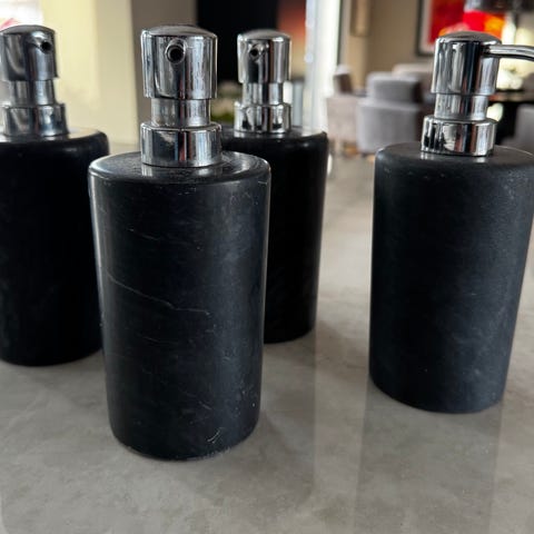 Matchende såpedispenser og tannkrus i matt svart. Kan hentes på Gullhella i Asker eller sendes hvis kjøper dekker porto.