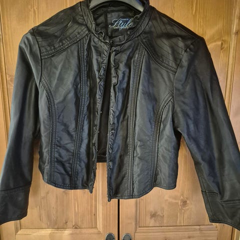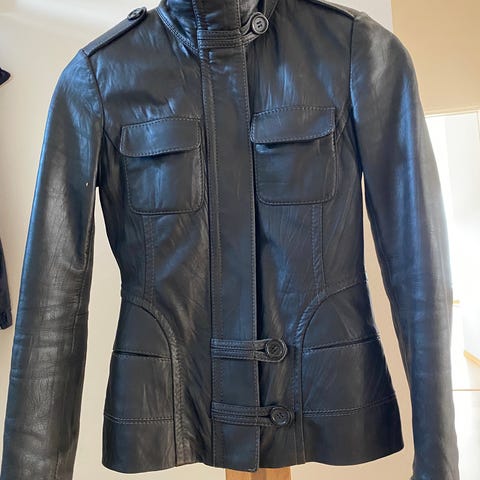 Mørkebrun skinnjakke men innsving, to glidelåslommer foran, fram stykket og bakstykke er semsket, mens armene er glatt. Jakken har en bred krage med en glidelås på innsiden. Det mangler en pelskrage som man enkelt kan ta av og på. Men denne er dessverre borte. (Den vil bli ettersendt til ny eier hvis den dukker opp).