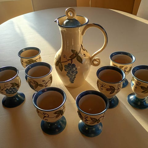 Kun stått i vitrineskap uten å ha vært i bruk. Hele og pene.