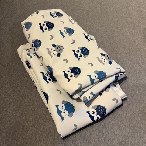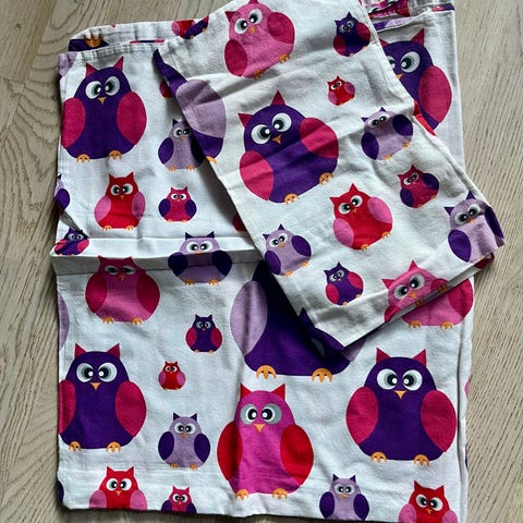 Selvsydde gardiner i bomull til barnerommet med uglemotiv selges for 200 kr + porto.