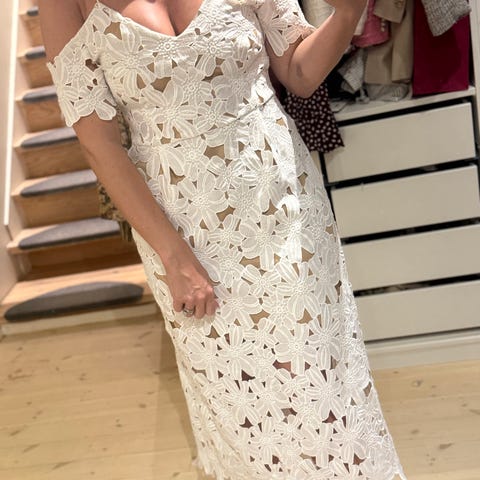 Blondekjole med underskjørt, som jeg dessverre aldri har fått brukt. Den stopper ca midt på låret og har lange ermer, men ermene er gjennomsiktige grunnet blondestoffet. Str. 10, som tilsvarer str. M. Den har dessverre blitt for liten for meg, men den fortjener virkelig å bli brukt! Har tatt den på for illustrasjon på første bilde, men den sitter mye bedre på en i riktig størrelse :)