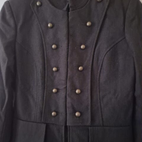 Jakken er kort modell str 42. Ca. 58 cm lang med skulderputer. Bredde målt fra armhulen til armhulen ca. 50cm. Lengde på armene målt under armhulen ca 48 cm.