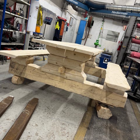 Bordplate og sittebenker er material av ask. Laftetømmeret er adelfure.