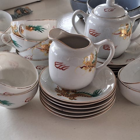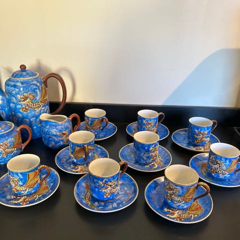 Japansk Kutani i ben porselen deler til te servise i dragedekor. Håndmalt og rikt dekorert fra 1940 årene. I meget god stand uten skår heller krakeleringer
