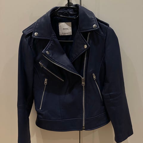 Råtøff blå skinnjakke i imitert skinn fra Mango. Str M. Fremstår som helt ny, ingen bruksmerker, brukt 1 gang. Tøff nå til sensommer og høst! Superfresh blåfarge som skiller seg ut! Kjøpt i Barcelona.