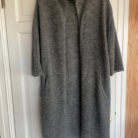Jakke -by Malene Birger, størrelse medium. Farger: offwhite/ cream og svart, fargene bidrar til kreativ design. 4 utenpå lommer. Lengde: ca 75 cm Kvalitet : 50%mohair, 30%ployamid, 20%akryl. Kvaliteten holder seg godt både i form og look. Brukt få ganger. Selges 450kr