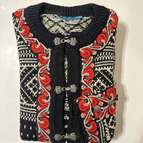 Veldig fin håndstrikket cardigan/jakke i grønt og hvitt mønster. Den sitter pent på og er både komfortabel og varm.