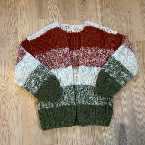 Hjemmestrikket Voringenser. Strikket i dobbel tråd fluff. Dobbel perlestrikk med flettemønster på armene. Størrelse M. Brukt svært lite da den er litt for stor for meg.
