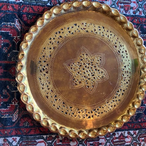 Dekorativt fat, til å henge på veggen, selges. Metall/messing. Noe bruksmerker/slitasje kan forekomme. Selges som det er. Se bilder.