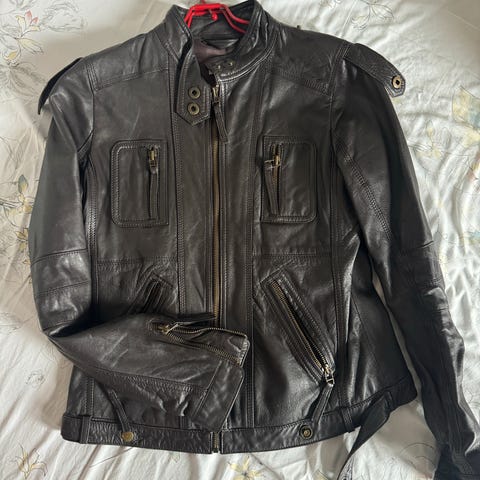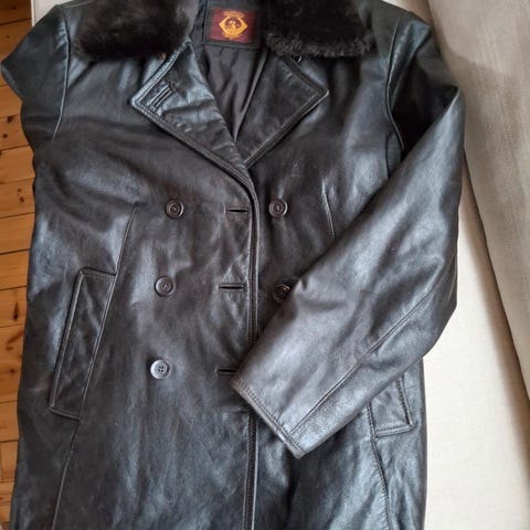 Lang skinnjakke, lite brukt. Mye lommer, belte. Jakken er ganske tung. Dame XL.
