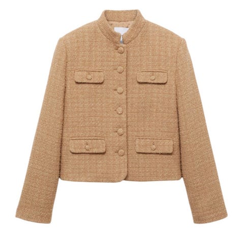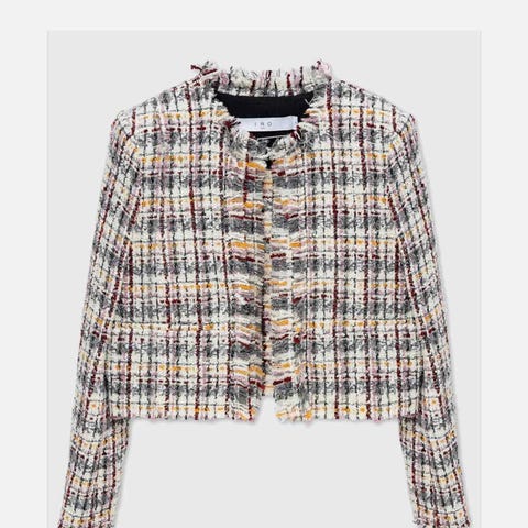En elegant jakke i eksklusivt flerfarget tweed-stoff. Et ikonisk spesiallaget stykke med sine markerte skuldre og dekorative krystallknapper. Jakken har en rett passform med firkantede lommer i front og ballongermer med mansjetter.