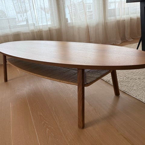 Pent brukt salongbord fra IKEA selges da det er litt for stort for den nye sofaen. Noen små skraper i bordplaten, ikke spesielt dype (se bilde). Ellers i bra stand. Må hentes.