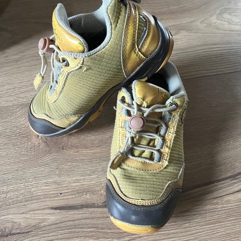 Ukjent merke joggesko for barn/unisex i størrelse 35. Skoene har gulbrun overdel med mørkere forsterkninger på tå og hæl, samt lys såle. De har hurtigsnøring med strikk og stopper, og polstret kant rundt ankelen for bedre komfort. Egnet som hverdagssko eller til lett uteaktivitet for barn i aktuell skostørrelse.