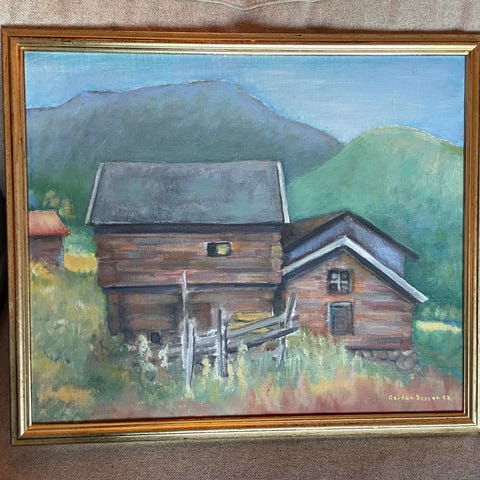 Idyllisk maleri av fjellseter signert T.Rema. Størrelse ca 51x71 cm. Noe slitt på ramme som vist på bilder. Koselig maleri som vil gjøre seg fint på hytten, annekset eller i stuen i byen for den saks skyld. Selges grunnet plassmangel.