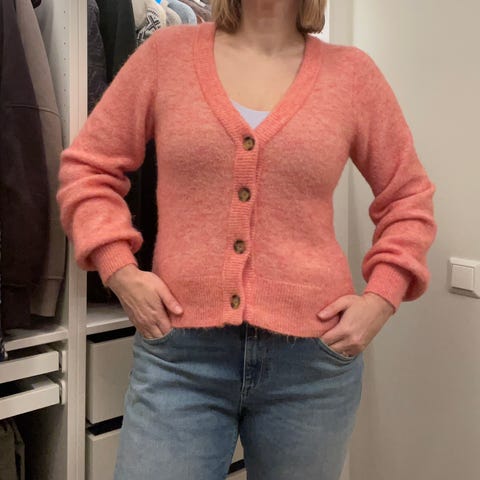 Hjemmestrikket novice mohair edition cardigan fra PetitKnit. Dusrosa.