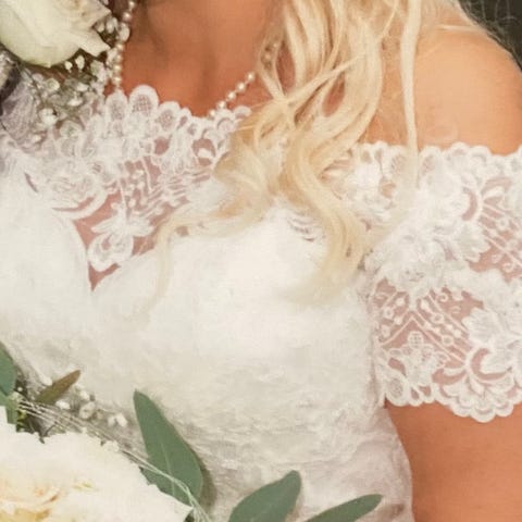 Te Lengde brudekjole , str L. Blonder , litt stiv i stoffet . Farge : Elfenben Glidekås bak Korsett lignende foran Kjøpt og brukt en gang i 2019 Kjøpt på side ala JJ house til 1600kr.