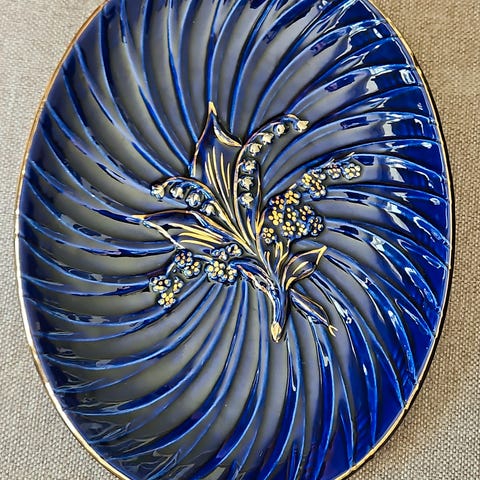 Keramikkfat med lys grå matt glasur og kant i blått og gull. Helt og fint, noe slitasje på gullet.