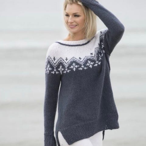 Strikket genser på pinne 6, i deilig mykt garn som heter Cloud fra Lanyarns. Strikket med litt innsving i midjen, selges for kr. 600,-. Passer en small/medium.