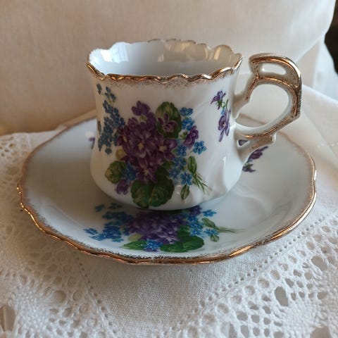 Pent brukt og nydelig kaffekopp med rosemønster. Lyseblå med glans og gulldetaljer. Står «Terra» under kopp og skål.