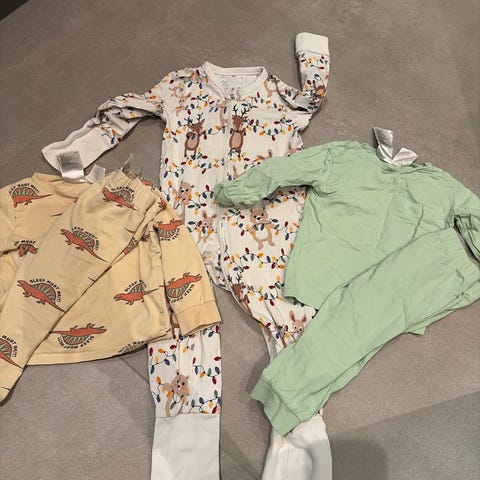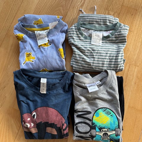 Inneholder to hele dresser, en med knepping, den med apene. Og dn med glidelås.
