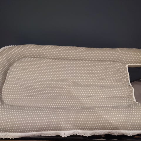Nydelig babynest hjemmelaget. Lite og pent brukt, som nytt. alltid hatt teppe i bunn så ingen gulping. Fra røyk og dyrefritt hjem. Denne kan også åpnes helt for å bruke den lenger. Følger med teppe i samme mønster. Kjøpt for kr 1200.ønsker kr 500. Eller seriøse bud.