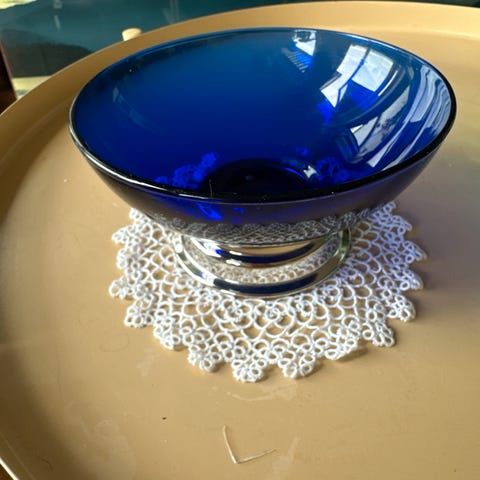 Elegant, eldre konfektskål med hank. Er litt usikker, men mener dette er beigefarget glass.