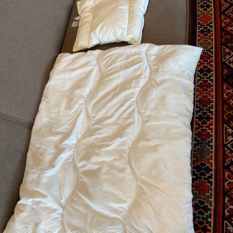 Pent brukt sengetøy til baby (5 stk.) Et par av dem er aldri brukt. Vaskbart tisselaken, babyhodepute, stretchlaken pluss en isbjørn bamse selges (putetrekk 33×39 cm dynetrekk 75×93cm)