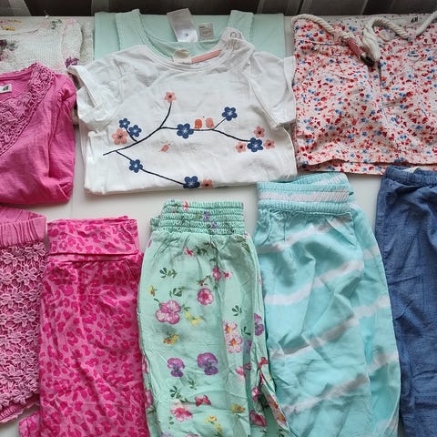 En kjole, et ballongskjørt og en topp i nydelige farger. Blir 73,- kr pr plagg, dette.