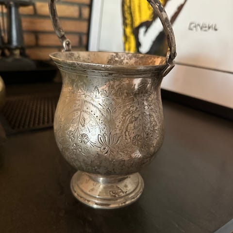 Brukt som vase for kunstige blomster i mange år, kun brukt inne av oss. Fått fra min onkel fra låven/løen hans. Aner ikke alder, huset har vært i familien i 200 år, men oljekanne er nok fra 1930-1960 tallet en gang.