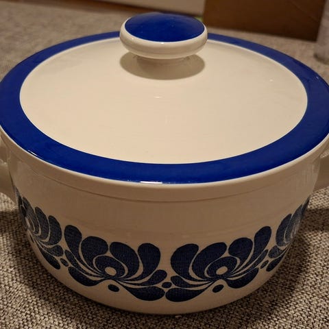 Nydelig gammel bolle fra Egersund. Produsert mellom 1963 og 1969. Normal bruksslitasje. Noe bruksslitasje på gullet. Ingen skår, nag eller krakkelering. 19 cm i diameter og 8 cm høy. Kan sendes mot at kjøper betaler porto på 69.-