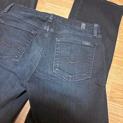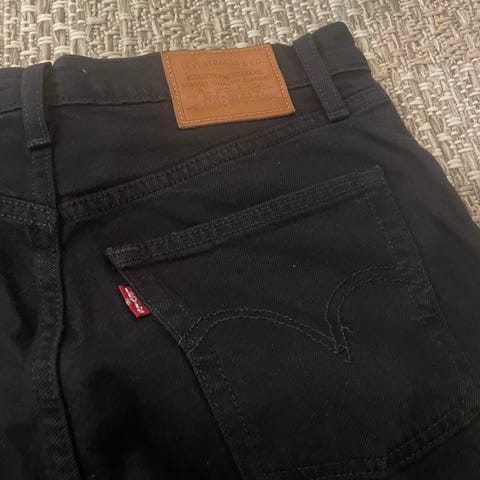 Selger disse svarte vintage jeansene som er vide/straight i modellen. Str 36 (litt oversized) og passer også 38. De er høye i livet! Tror det egentlig er herremodell!