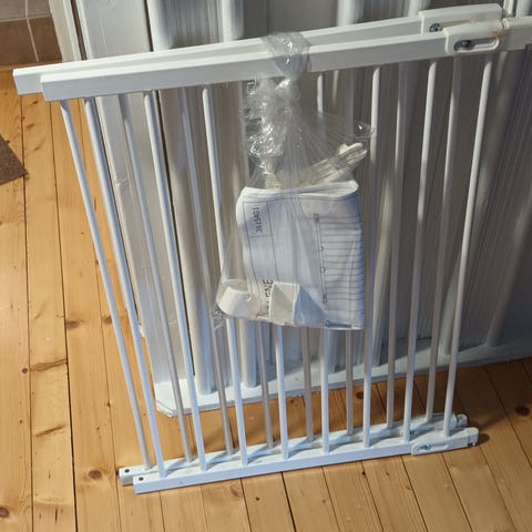Fin og sikker babygrind til baby. Solid og smart sammenleggbar. Her kan poden kose seg i tygge omgivelser.