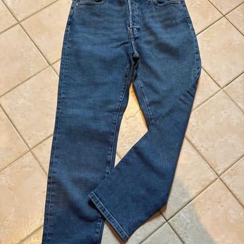 Buksen er brukt kun en gang, men ellers ny. Mellom mørk blåfarge. Buksen er i bomull og lyocell. Den har høyt liv. Selges fordi den ikke passer. Kan sendes og kjøper betaler frakt.