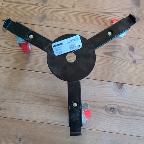 Størelsen 29cm i diameter, i støpejern med plastikk hjul (den ene hjul er ødelagt ved et uhell, men det er ikke noe funksjonsbetydning)
