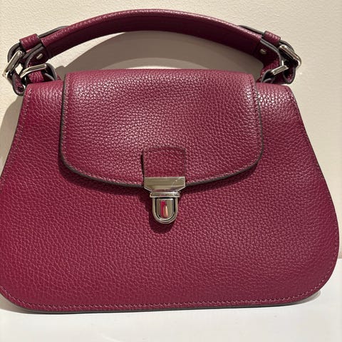 Nydeleg veske laget av svart skinn og handfarga hamp.