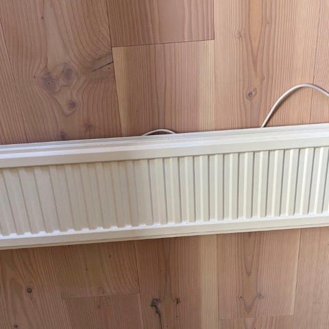Ovnen er 30 cm høy og 169 cm lang og på 800 W. Selges for 1500 kr..