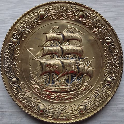 Lite bilde i messing, av en skute, selge. Made in england. Noe bruksmerker/slitasje kan forekomme. Selges som det er. Se bilder.
